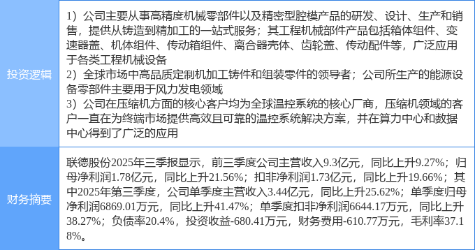证券之星消息,联德股份10月30日涨停收盘,收盘价32.34元。该股于9点34分涨停,未打开涨停,截止收盘封单资金为2787.79万元,占其流通市值0.36%。