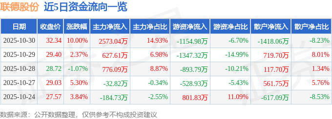 10月30日的资金流向数据方面,主力资金净流入2573.04万元,占总成交额14.93%,游资资金净流出1154.98万元,占总成交额6.7%,散户资金净流出1418.06万元,占总成交额8.23%。