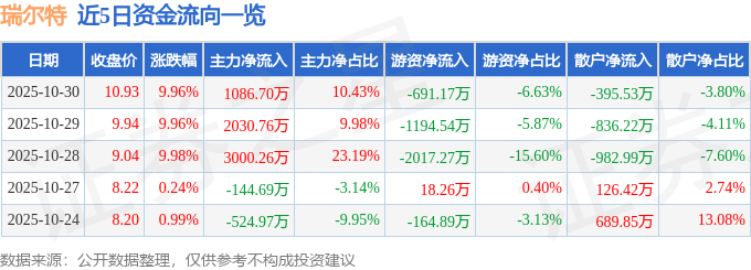10月30日的资金流向数据方面,主力资金净流入1086.7万元,占总成交额10.43%,游资资金净流出691.17万元,占总成交额6.63%,散户资金净流出395.53万元,占总成交额3.8%。