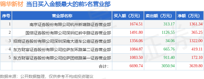 证券之星消息,沪深交易所2025年10月30日公布的交易公开信息显示,锦华新材(920015)因当日换手率达到20%的前5只股票登上龙虎榜。此次是近5个交易日内第5次上榜。