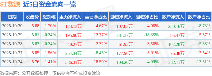 证券之星消息,截至2025年10月30日收盘,ST数源(000909)报收于5.88元,上涨1.2%,换手率1.02%,成交量4.48万手,成交额2635.81万元。
