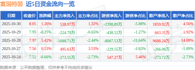 证券之星消息,截至2025年10月30日收盘,富瑞特装(300228)报收于8.05元,上涨1.26%,换手率9.13%,成交量50.23万手,成交额4.08亿元。
