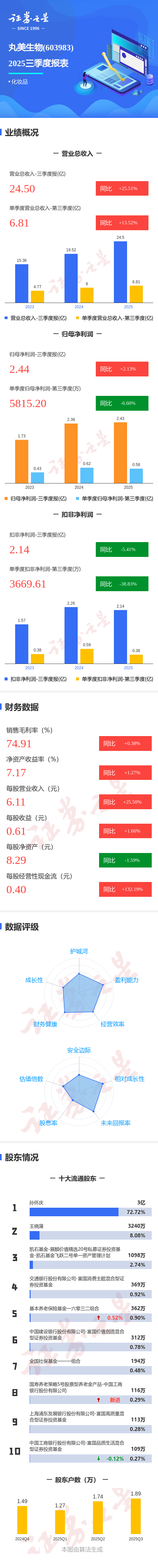证券之星消息,丸美生物2025年三季报显示,前三季度公司主营收入24.5亿元,同比上升25.51%;归母净利润2.44亿元,同比上升2.13%;扣非净利润2.14亿元,同比下降5.42%;其中2025年第三季度,公司单季度主营收入6.81亿元,同比上升13.52%;单季度归母净利润5815.2万元,同比下降6.61%;单季度扣非净利润3669.61万元,同比下降38.83%;负债率30.03%,投资收益1682.37万元,财务费用-1589.43万元,毛利率74.91%。