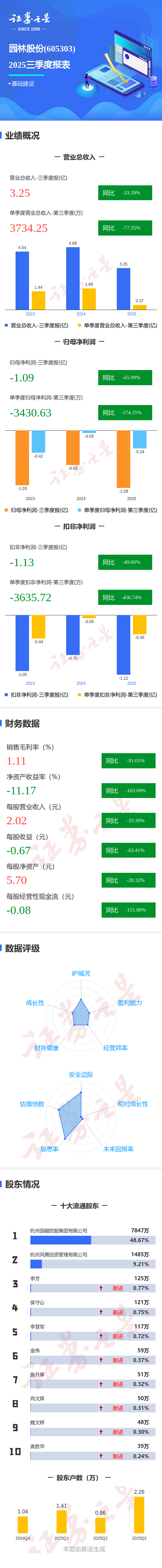 证券之星消息,园林股份2025年三季报显示,前三季度公司主营收入3.25亿元,同比下降33.4%;归母净利润-1.09亿元,同比下降65.99%;扣非净利润-1.13亿元,同比下降49.61%;其中2025年第三季度,公司单季度主营收入3734.25万元,同比下降77.55%;单季度归母净利润-3430.63万元,同比下降574.35%;单季度扣非净利润-3635.72万元,同比下降456.75%;负债率53.44%,投资收益-374.76万元,财务费用-1387.93万元,毛利率1.11%。