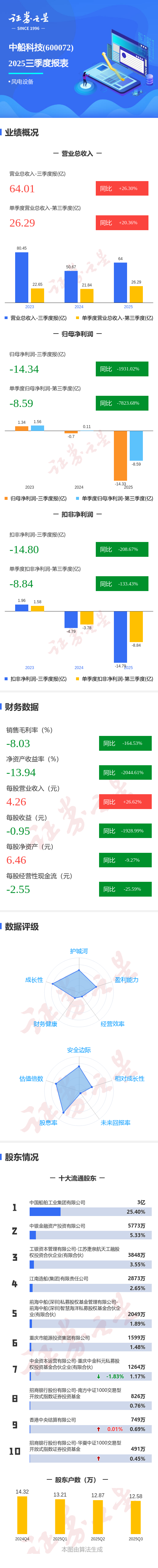 证券之星消息,中船科技2025年三季报显示,前三季度公司主营收入64.01亿元,同比上升26.3%;归母净利润-14.34亿元,同比下降1931.02%;扣非净利润-14.8亿元,同比下降208.68%;其中2025年第三季度,公司单季度主营收入26.29亿元,同比上升20.37%;单季度归母净利润-8.59亿元,同比下降7823.68%;单季度扣非净利润-8.84亿元,同比下降133.44%;负债率77.38%,投资收益5961.06万元,财务费用2.94亿元,毛利率-8.03%。