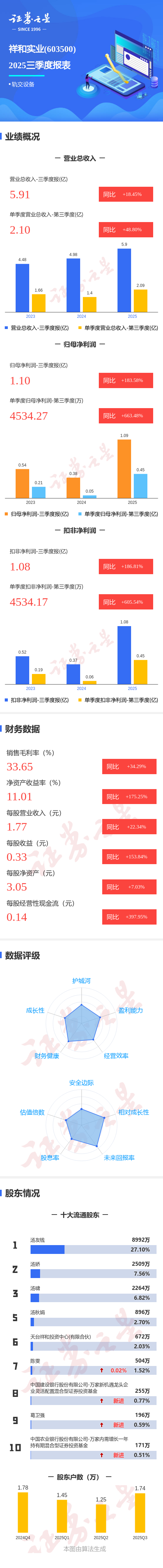 证券之星消息,祥和实业2025年三季报显示,前三季度公司主营收入5.91亿元,同比上升18.46%;归母净利润1.1亿元,同比上升183.59%;扣非净利润1.08亿元,同比上升186.82%;其中2025年第三季度,公司单季度主营收入2.1亿元,同比上升48.8%;单季度归母净利润4534.27万元,同比上升663.49%;单季度扣非净利润4534.17万元,同比上升605.54%;负债率30.35%,投资收益507.96万元,财务费用124.42万元,毛利率33.65%。
