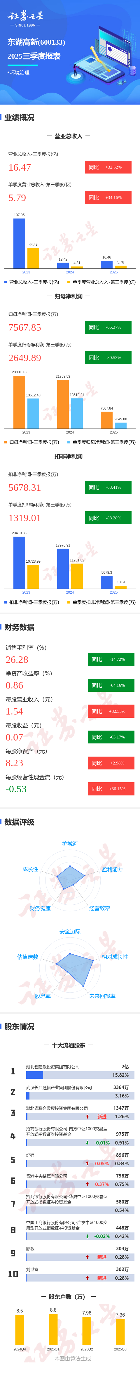 证券之星消息,东湖高新2025年三季报显示,前三季度公司主营收入16.47亿元,同比上升32.53%;归母净利润7567.85万元,同比下降65.37%;扣非净利润5678.31万元,同比下降68.41%;其中2025年第三季度,公司单季度主营收入5.79亿元,同比上升34.16%;单季度归母净利润2649.89万元,同比下降80.53%;单季度扣非净利润1319.01万元,同比下降88.29%;负债率47.77%,投资收益3299.66万元,财务费用9395.9万元,毛利率26.28%。