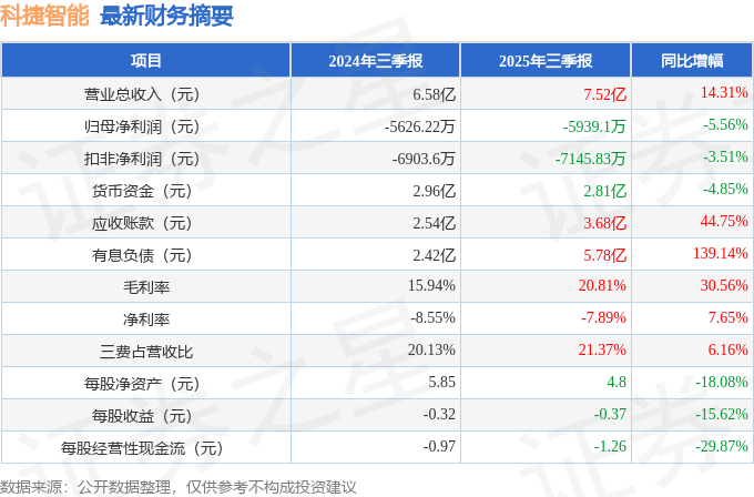 据证券之星公开数据整理,近期科捷智能(688455)发布2025年三季报。截至本报告期末,公司营业总收入7.52亿元,同比上升14.31%,归母净利润-5939.1万元,同比下降5.56%。按单季度数据看,第三季度营业总收入2.61亿元,同比上升47.08%,第三季度归母净利润-2211.39万元,同比下降59.51%。本报告期科捷智能存货明显上升,存货同比增幅达89.43%。