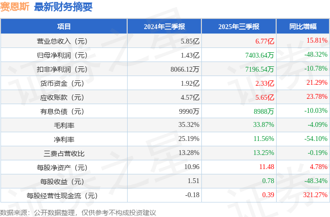 据证券之星公开数据整理,近期赛恩斯(688480)发布2025年三季报。截至本报告期末,公司营业总收入6.77亿元,同比上升15.81%,归母净利润7403.64万元,同比下降48.32%。按单季度数据看,第三季度营业总收入2.54亿元,同比上升11.13%,第三季度归母净利润2500.81万元,同比下降10.36%。本报告期赛恩斯公司应收账款体量较大,当期应收账款占最新年报归母净利润比达312.63%。