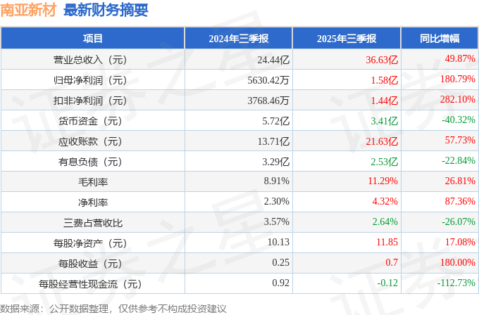 据证券之星公开数据整理,近期南亚新材(688519)发布2025年三季报。截至本报告期末,公司营业总收入36.63亿元,同比上升49.87%,归母净利润1.58亿元,同比上升180.79%。按单季度数据看,第三季度营业总收入13.58亿元,同比上升63.04%,第三季度归母净利润7090.85万元,同比上升6900.38%。本报告期南亚新材应收账款上升,应收账款同比增幅达57.73%。