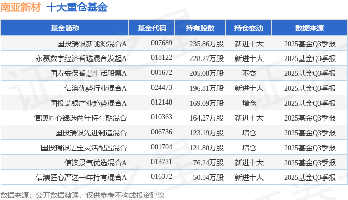 持有南亚新材最多的基金为国投瑞银新能源混合A,目前规模为21.48亿元,最新净值2.2617(10月29日),较上一交易日上涨2.66%,近一年上涨59.94%。该基金现任基金经理为施成。