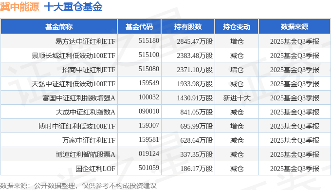 持有冀中能源最多的基金为易方达中证红利ETF,目前规模为90.51亿元,最新净值1.3964(10月30日),较上一交易日下跌0.41%,近一年上涨9.86%。该基金现任基金经理为林伟斌 宋钊贤。