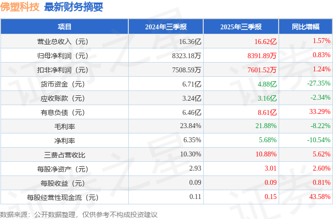 据证券之星公开数据整理,近期佛塑科技(000973)发布2025年三季报。截至本报告期末,公司营业总收入16.62亿元,同比上升1.57%,归母净利润8391.89万元,同比上升0.83%。按单季度数据看,第三季度营业总收入5.84亿元,同比上升2.66%,第三季度归母净利润3092.88万元,同比下降5.88%。本报告期佛塑科技公司应收账款体量较大,当期应收账款占最新年报归母净利润比达264.24%。
