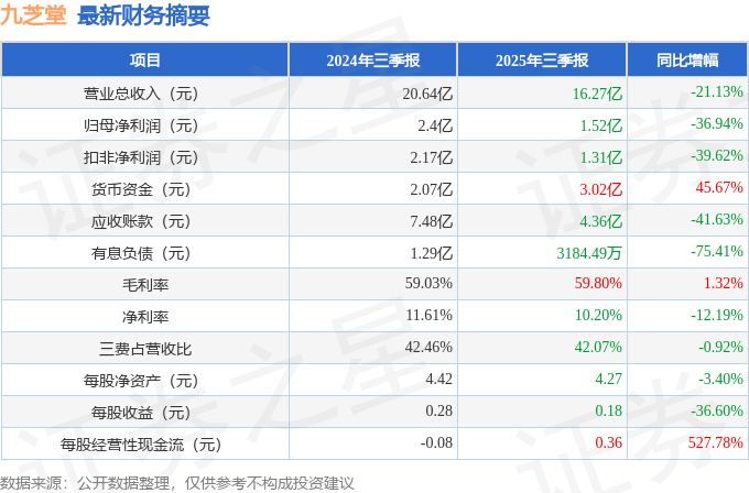 据证券之星公开数据整理,近期九芝堂(000989)发布2025年三季报。根据财报显示,九芝堂净利润同比下降36.94%。截至本报告期末,公司营业总收入16.27亿元,同比下降21.13%,归母净利润1.52亿元,同比下降36.94%。按单季度数据看,第三季度营业总收入3.63亿元,同比下降5.51%,第三季度归母净利润775.8万元,同比下降78.3%。