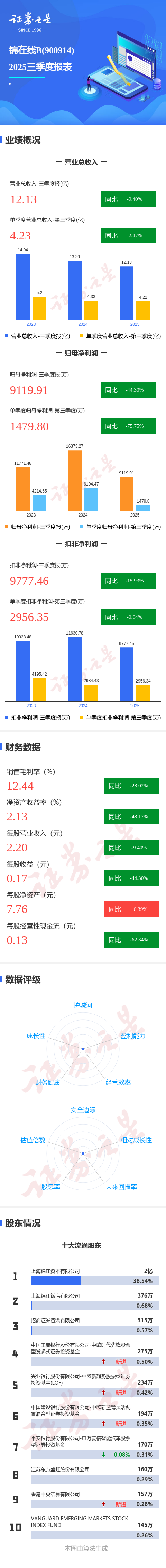 证券之星消息,锦在线B2025年三季报显示,前三季度公司主营收入12.13亿元,同比下降9.4%;归母净利润9119.91万元,同比下降44.3%;扣非净利润9777.46万元,同比下降15.93%;其中2025年第三季度,公司单季度主营收入4.23亿元,同比下降2.48%;单季度归母净利润1479.8万元,同比下降75.76%;单季度扣非净利润2956.35万元,同比下降0.94%;负债率19.24%,投资收益8609.72万元,财务费用-2001.35万元,毛利率12.44%。