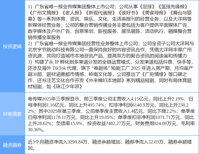 证券之星消息,粤 传 媒11月3日涨停收盘,收盘价11.59元。该股于9点25分涨停,未打开涨停,截止收盘封单资金为1.57亿元,占其流通市值1.2%。