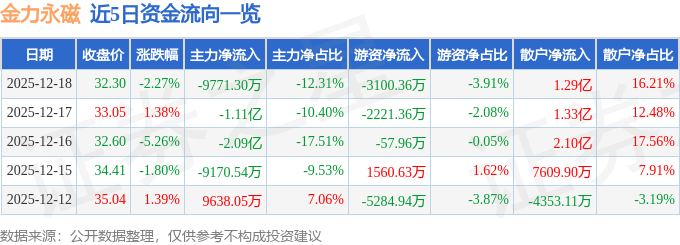 证券之星消息,截至2025年12月18日收盘,金力永磁(300748)报收于32.3元,下跌2.27%,换手率2.14%,成交量24.23万手,成交额7.94亿元。