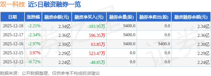 双一科技融资融券信息显示,融资方面,当日融资买入1764.19万元,融资偿还1948.14万元,融资净偿还183.95万元。融券方面,融券卖出0.0股,融券偿还0.0股,融券余量9400.0股,融券余额28.75万元。融资融券余额2.34亿元。