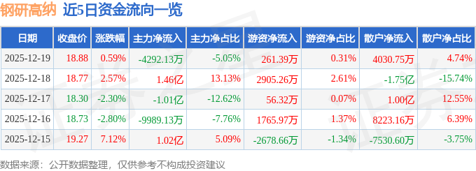 证券之星消息,截至2025年12月19日收盘,钢研高纳(300034)报收于18.88元,上涨0.59%,换手率5.87%,成交量45.0万手,成交额8.5亿元。
