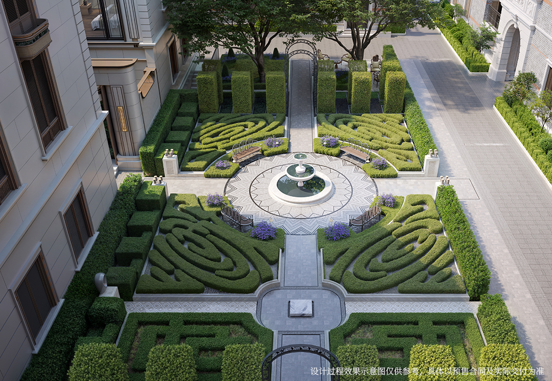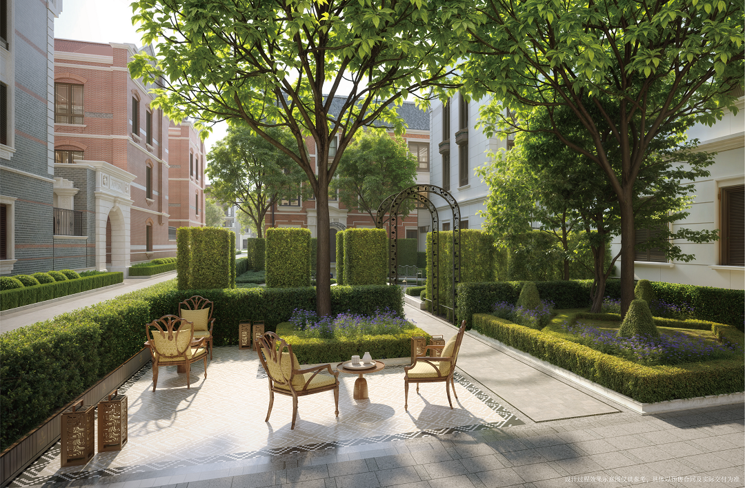 同时德康里所定义的庄园式风貌新组团,同源法式庄园秩序规制,不是对经典的简单复刻,而是对优雅礼序与空间规制的深度延续与当代演绎。中轴对称的景观布局,从喷泉叠水到林荫步道,每一步都踏在严谨而浪漫的韵律之上。让法式优雅的景观与海派底蕴相融,既能承载历史记忆,又能满足业主花园松弛社交等需求。